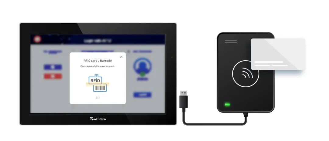 威綸通HMI通過USB連接RFID刷卡機,實現RFID刷卡身份驗證功能。用戶只需刷卡,即可快速登錄人機系統,整個過程只需幾秒鐘的時間,極大地加速了身份驗證流程。此外,企業還可以結合現有的門禁卡、識別證、工牌等相關證件,使管理更加簡易。