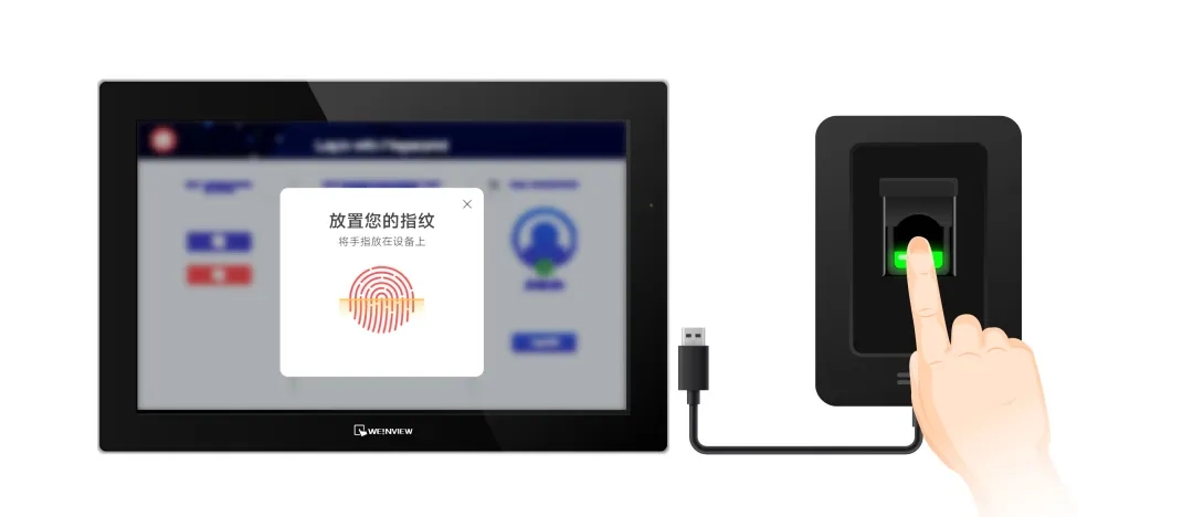 威綸通HMI通過USB連接指紋機(相關型號可咨詢威綸通工作人員),可進行指紋身份驗證。用戶只要將手指放在指紋機上,即可完成身份驗證,并登錄人機系統。指紋識別驗證依靠生物特性更難以被仿冒,其安全性更上一層樓。