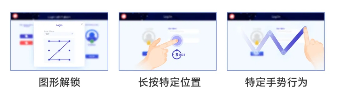 除了上述的刷卡/指紋登錄方式外,還有其它新穎的登錄方式能通過 JavaScript 實現,如手機上常見的圖形解鎖,或是操作行為識別,像是通過長按特定位置或特定手勢行為以登錄人機系統。這些登錄方式跨越傳統,為用戶帶來了更新穎的操作體驗。