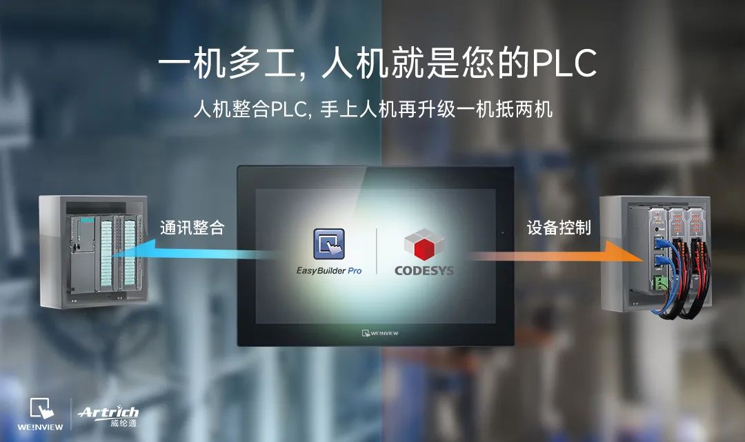 威綸通早在2017年就開始了與CODESYS在產品研發端的合作,目前主推的cMT X系列人機界面支持CODESYS可編程控制功能,可實現直接對遠程I/O進行通訊和控制,同時借助其本身的多元監控及IIoT能力,能夠滿足用戶低成本對設備進行人機監控+邏輯編程+運動控制+數據整合的應用場景,實現“一機多工,人機就是您的PLC”!